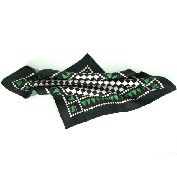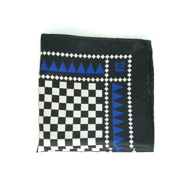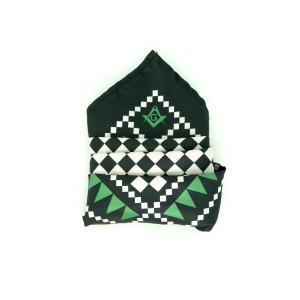 A black and white chequered pocket square with the masonic square, compass and G symbol displayed on the corners in green.