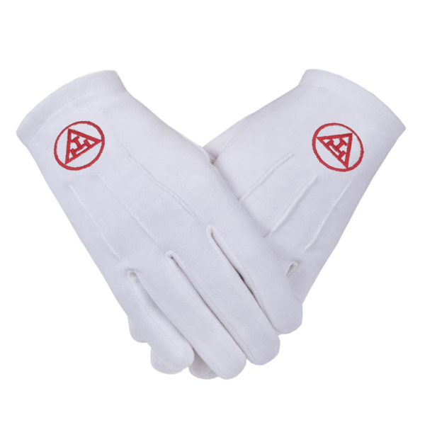 Royal Arch Masonic Cotton Gloves Embroidered With Red Thread Triple Tau symbol.